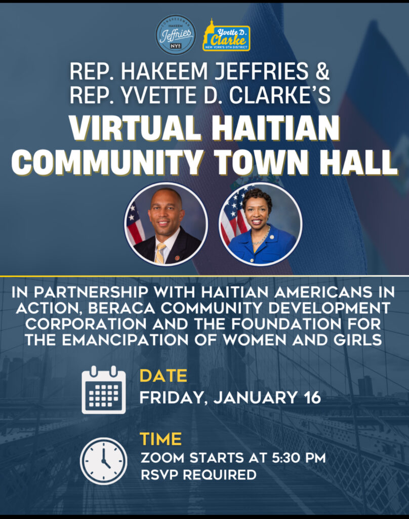 Join the Virtual Haitian Community Town Hall Meeting on TPS Friday, January 16th, with Democratic Leader Hakeem Jeffries and Congresswoman Yvette Clarke.